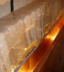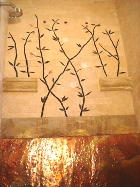 Shower wall with fountain, floral mosaic.